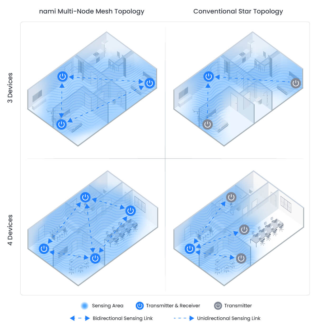 With nami’s multi-node mesh topology, each device acts as both a sensing node and a network participant. Such topology has been patented by nami, independently of which CSI processing engine vendor is used.